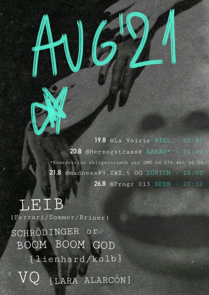 Trois courts concerts avec le duo zurichois Schrödinger ou Boom Boom God, le trio bernois Leib et le projet solo VQ de l’artiste vocale argentine Lara Alarcón.