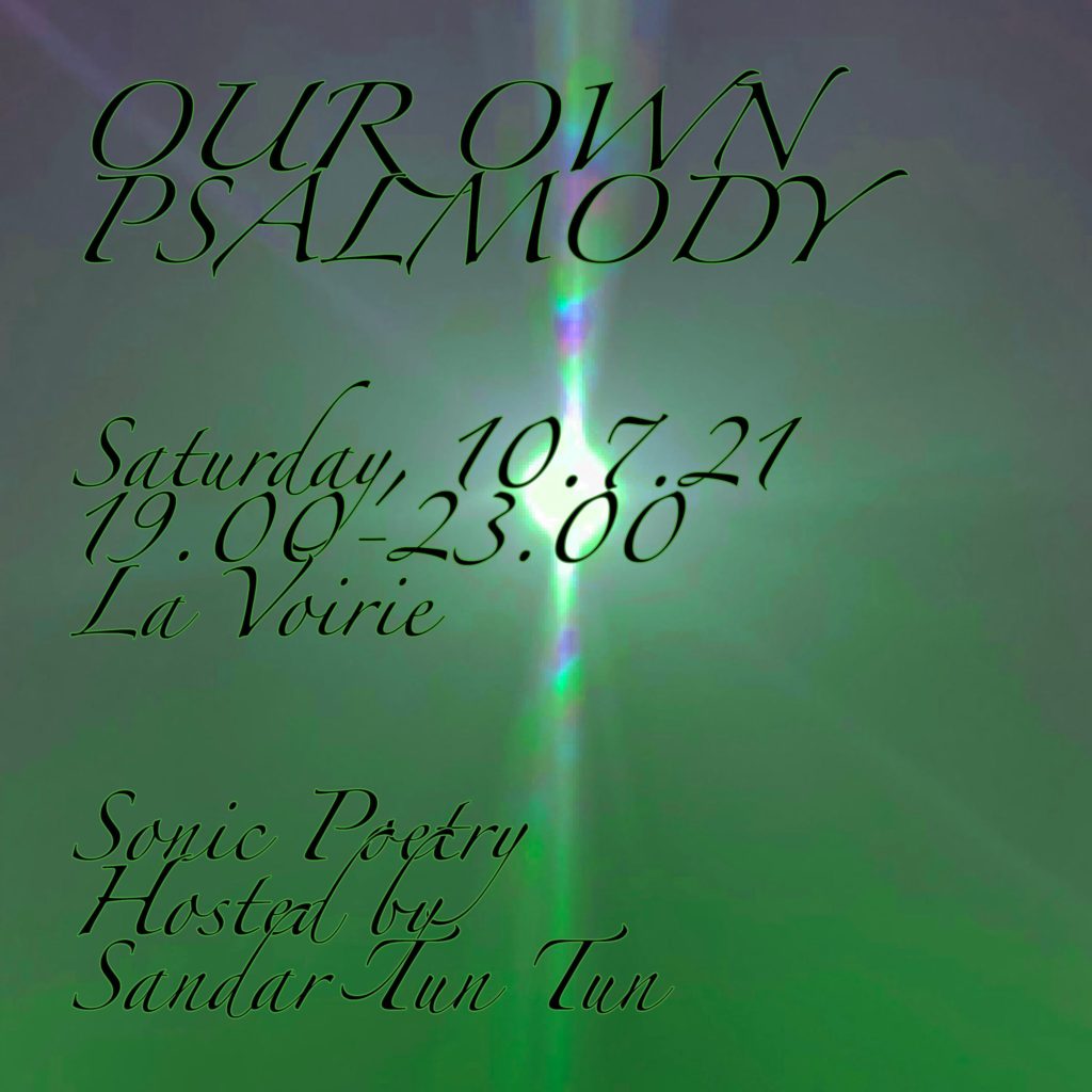 *Our Own Psalmody* est une soirée de poésie sonore et performée qui prend place dans le cadre du finissage de l’exposition CASTING SHADES AT NEW MOON et propose un espace pour envisager de nouvelles formes de culte, de fabulations et de fictions sonores, en mettant l’accent sur l’écoute et la voix comme principaux vecteurs d’un état/expérience poétique, spirituelle et politique. *Our Own Psalmody* présente des interventions musicales et performatives d’artistes, de poètes, de DJs et de musicien·x·ne·s dont les pratiques et les vies invoquent d’autres croyances-alliances et visent à créer un terrain commun par le biais de la danse, des mots et de la musique.