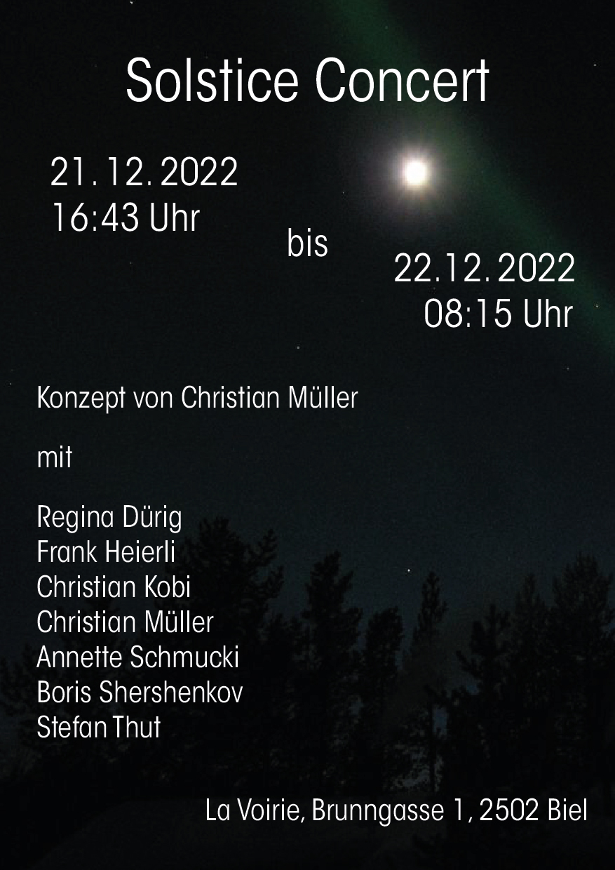 La nuit du 21 au 22 décembre sera la plus longue de l’année. Le musicien et compositeur biennois Christian Müller convie sept musicien.ne.s, performers, et artistes de renom de la scène contemporaine et expérimentale de l’improvisation à s’unir pour un concert d’une durée d’environ 15 heures trente, du coucher au lever du soleil. L’ensemble électroacoustique permettra la rencontre de musicien.ne.s aux approches stylistiques et aux parcours différents. L’événement, qui intégrera également une autrice, aura un caractère fondamentalement interdisciplinaire.