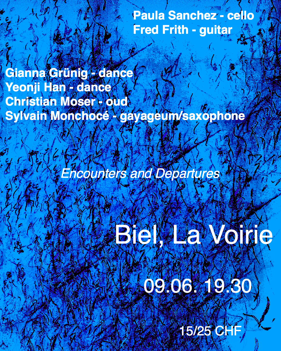 Un espace, une danseuse, un danseur, deux musiciens, quatre improvisateur·rice·s, des possibilités infinies. Des paysages sonores en mouvement, un magnétisme circulaire entre les corps et les sons, des pensées méditatives, des moments de poésie abstraite – un voyage philosophique dans les propres sensations corporelles. Les explorations du quatuor sont sans fin et imperturbables.