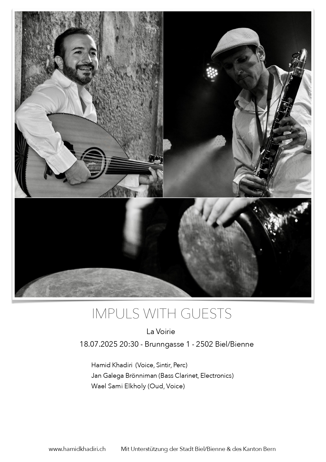 L’idée du projet Impuls est d’offrir aux musiciens de la scène musicale suisse une plateforme pour une improvisation libre. Cela ouvre une voie de jeu pour une interprétation contemporaine d’une musique intemporelle. Avec l’intention de faire naître quelque chose de nouveau et de relier et d’élargir les cultures musicales, Hamid Khadiri invite sans cesse de nouveaux musiciens à créer une musique contemporaine unique et à entremêler différentes traditions. Pour le concert du 18/07/2025 à La Voire à Bienne, il a fait appel à Jan Galega Brönnimann et Wael Sami Elkholy pour ce projet.