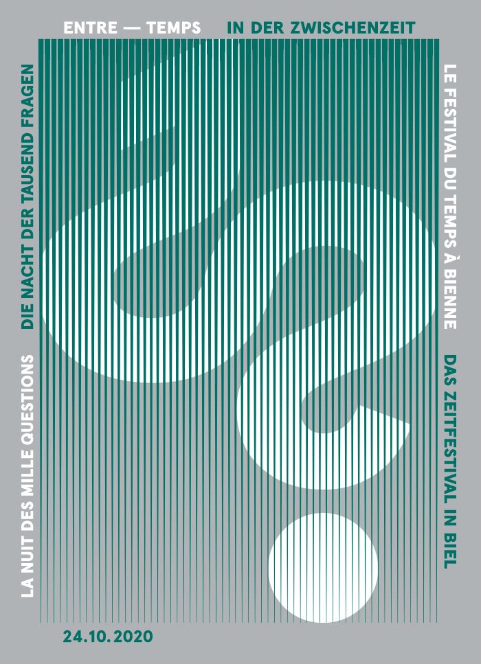 En 2020, La Nuit des 1000 Questions vivra sa septième édition, la troisième dans sa « nouvelle » formule. Désormais ancré en vieille ville de Bienne, le festival axe, depuis 2016, sa réflexion sur le temps (qui passe). Chaque édition du festival entend aborder le temps sous un angle différent. Que savons-nous du temps, dimension qui structure notre vie et nous paraît à la fois concret et très abstrait, immédiat et insaisissable ? Sans cesse, le temps transforme le futur en présent, puis en passé. Nous pensons souvent qu’il nous appartient : nous prenons du temps, nous l’économisons, nous le gaspillons et parfois nous l’offrons. Mais que fait-il de nous ? Le temps, se déroule-t-il toujours à la même vitesse ? Pourquoi semble-t-il souvent passer trop vite ou trop lentement ? À toutes ces questions, combien de réponses peu définitives… Alors parlons-en !